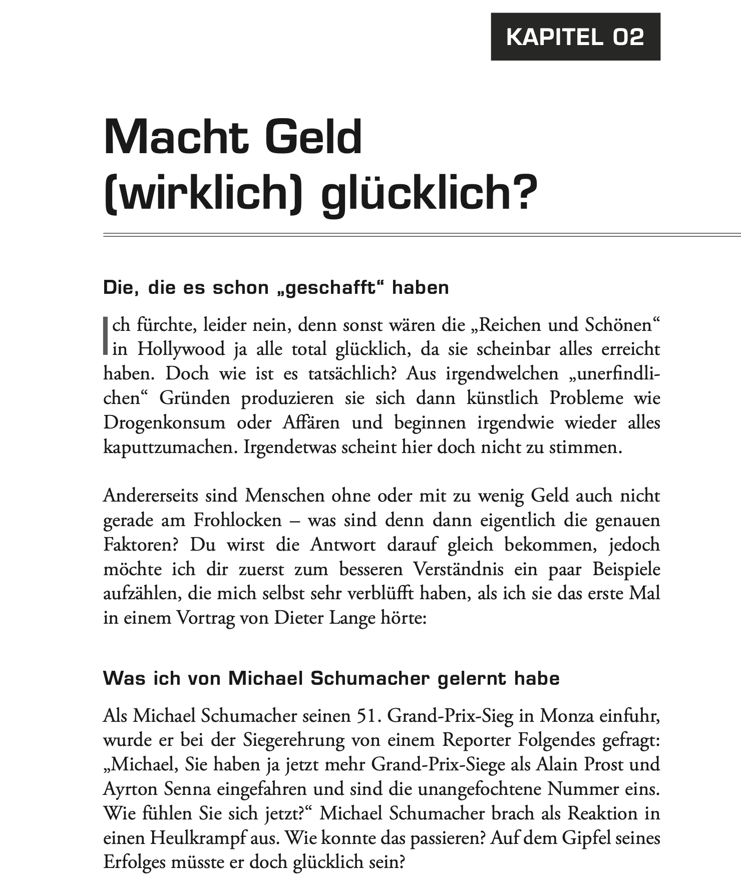 "Das Glück liegt außerhalb der Komfortzone" - dieser Gedanke beschreibt, dass persönliches Wachstum immer mit neuen, ungewohnten Erfahrungen verbunden ist. Wer bereit ist, Risiken einzugehen, schafft die Grundlage für echten Fortschritt. Das Buch zeigt praxisnah, wie man kleine Schritte geht, um diese Zone zu erweitern.