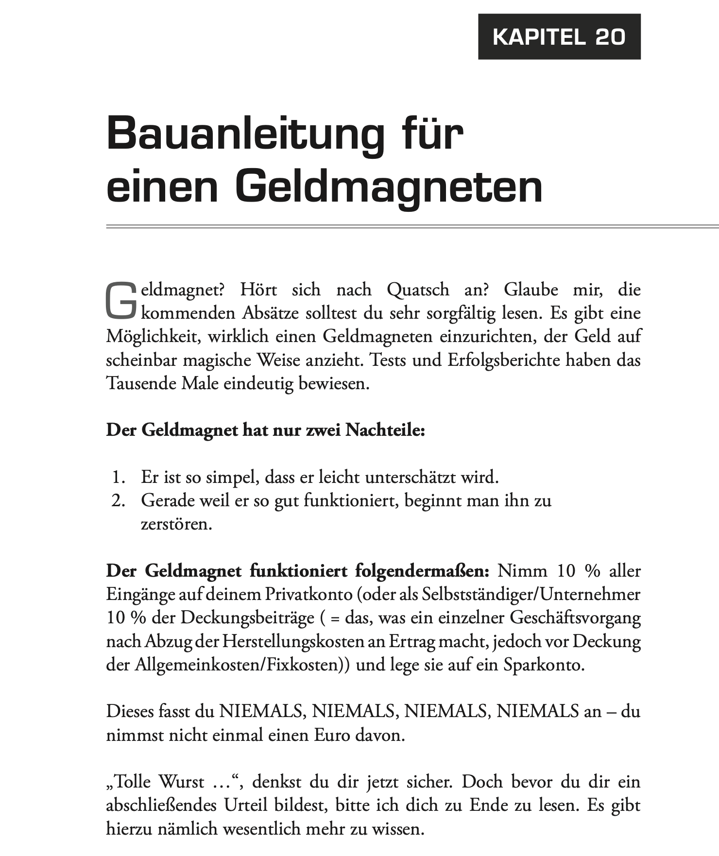 Ein Geldmagnet ist ein System, das Einnahmen planbar und skalierbar macht. Es geht darum, Strukturen zu schaffen, die unabhängig von reiner Arbeitszeit Einkommen generieren. Das Buch liefert Schritt-für-Schritt-Anleitungen, wie man so ein System entwickelt. Als Beispiel: Das Überweisen von 10 % aller zusätzlichen {unregelmäßigen} Einnahmen neben dem Gehalt auf ein Tagesgeldkonto, diese sind kostenlos und schnell digital eröffnet. Das gleiche kann man mit dem Rest am Monatsende machen, dabei geht es nicht um die Summe, sondern nur darum das, dass Geldmagnet Konto stetig wächst und NIEMALS weniger wird.