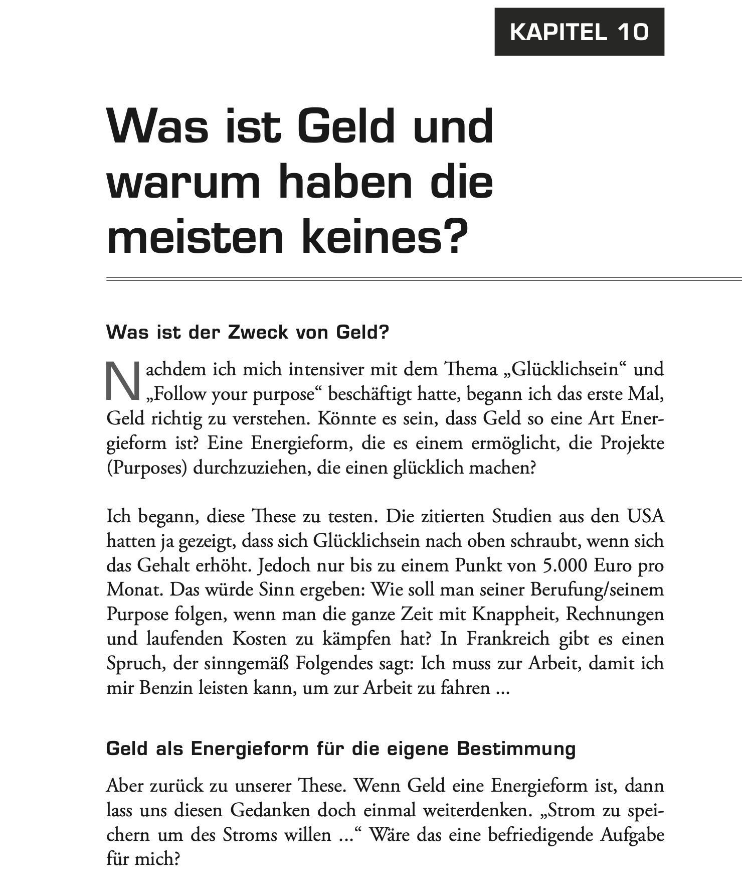 Purpose bedeutet, den tieferen Sinn im eigenen Leben zu erkennen. Wer sein "Warum" kennt, kann Entscheidungen leichter treffen und Energie aus seiner inneren Quelle schöpfen. Im Buch findest du konkrete Übungen und Denkanstöße, um den eigenen Purpose zu entdecken. Als Beispiel: Stell dir ein Problem in Richtung deiner korrekten Idealsituation vor, ohne deine Purpose zu kennen, bist du ein kleines Modell Elektroauto, das immer gegen eine Betonwand {das Problem} fährt. Mit deinem Purpose hast du die Antriebskraft einer Rakete mit Wasserstofftanks ohne Limit. Was passiert jetzt mit der Betonwand?